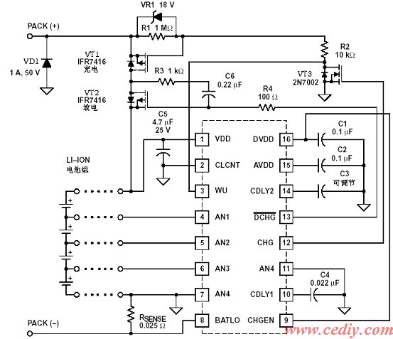 引脚10CDLY1:该引脚为短路保护的延迟时间控制引脚,在该引脚与AN4引脚间连接电容的数值决定过电流的时间,当过电流时控制放电MOSFET晶体管的关断时间,电容的数值也决定打嗝儿过电流保护的时间。